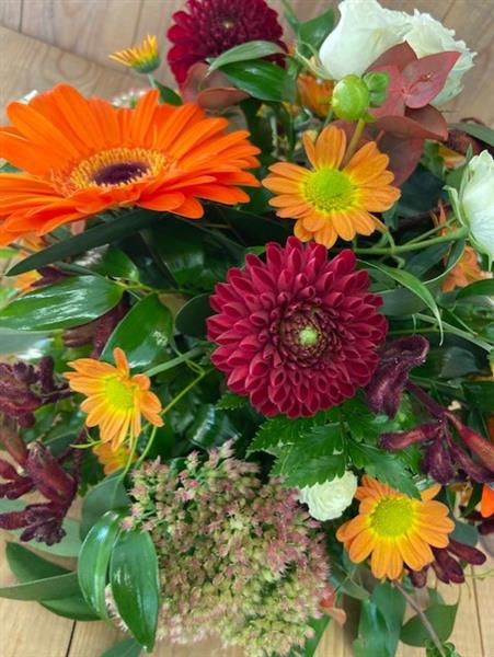 A compact posy arrangement created using seasonal flowers and foliage. Available in autumnal shades as pictured or a range of different colours.