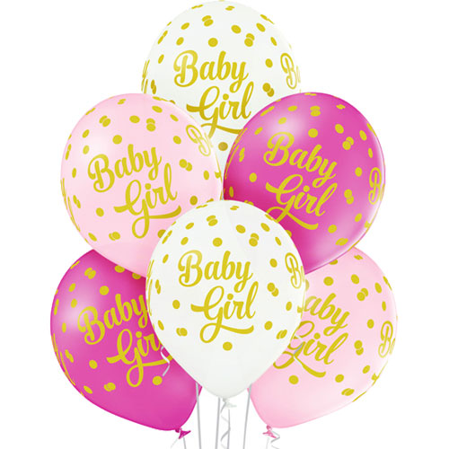These 12 inch latex balloons have a pretty gold polka dot design and 'Baby Girl' message, ideal for baby shower's or Christening's! An assortment of white, pink and rose colours