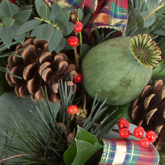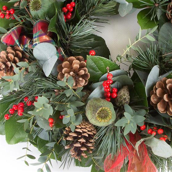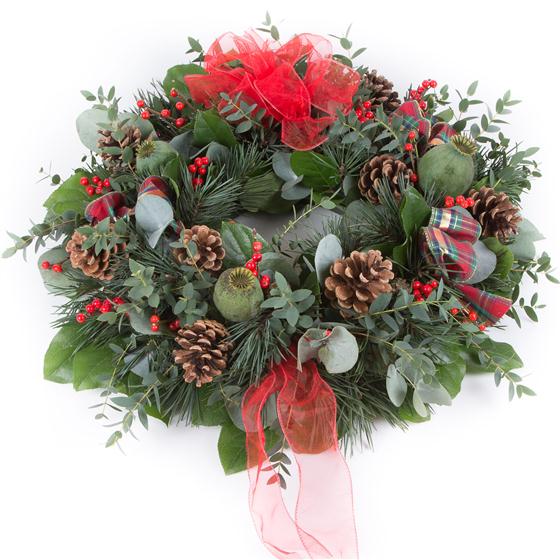 An 18 inch fresh spruce door wreath including ribbon and cones. A perfect, long lasting gift.