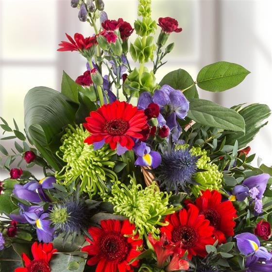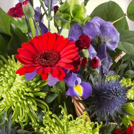 A classic basket and modern blooms fuse together to create a vibrant red, purple and lime display.