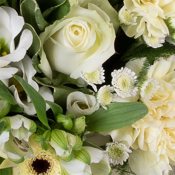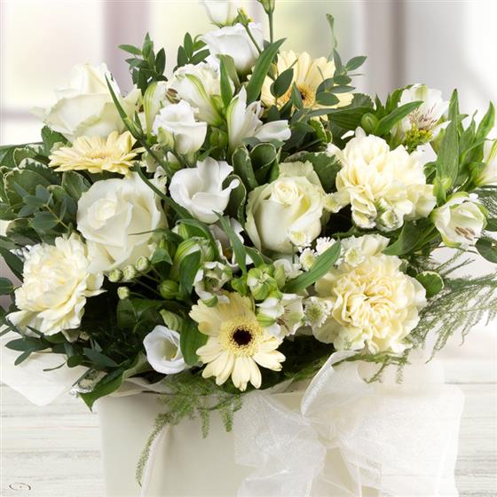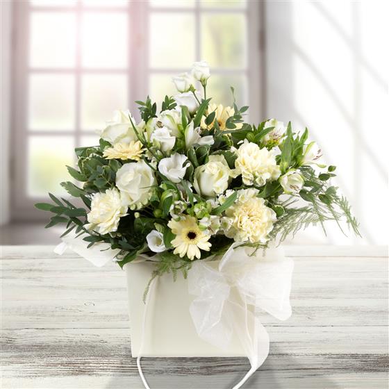 A delightful gift bag of pale lemons and whites, including roses, gerbera, carnations, alstromeria with wispy asparugus fern.