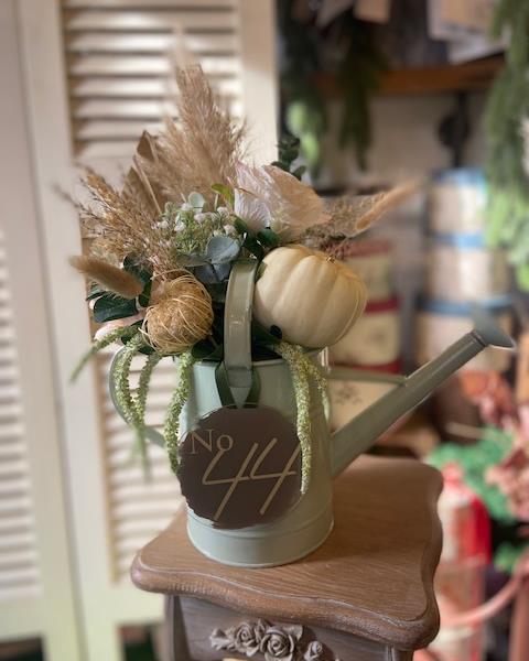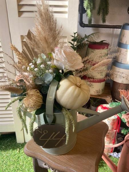 Our gorgeous watering can come in sage green, or cream personalised with the number of your home, compramising of pampas, dried and artificial flower finished off with a pumpkin.