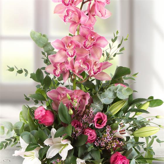 A spectacular cymbidium orchid arrangement with scented lilies, roses and delicate foliage.