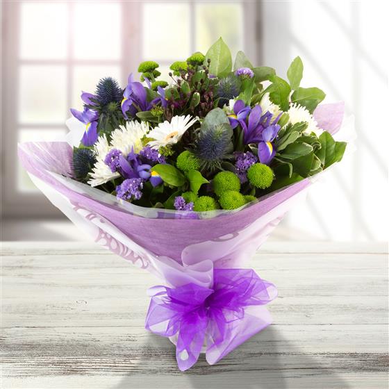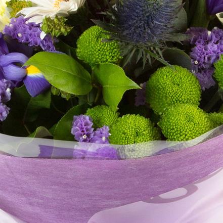 Vibrant limes and purples create a zesty combination of flowers and foliage including alstromeria, carnations, thistles and chrysanthemums.