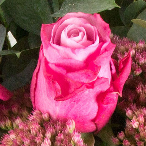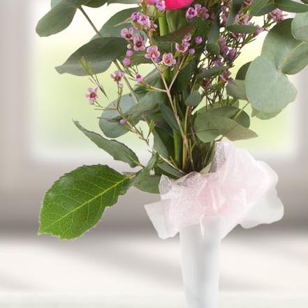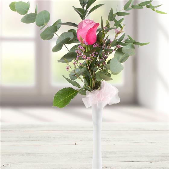 A single long stemmed pink rose presented in a vase with mixed foliage sends a simple message.