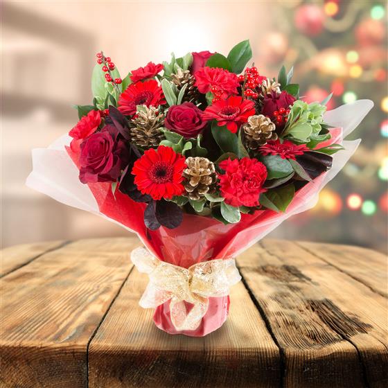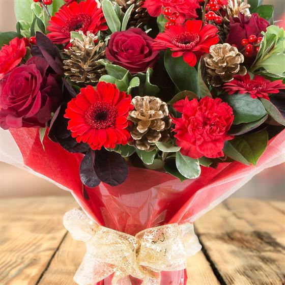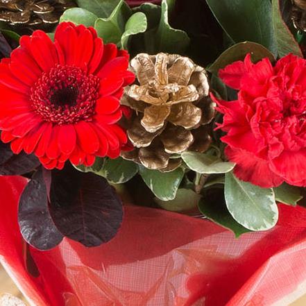 A striking all red hand-tied aqua bouquet of roses, gerberas, carnations and berries including golden cones.