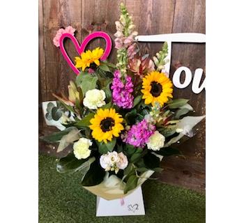 Send rays of sunshine with this colourful selection of golds, purples and bright pinks. To avoid disappointment please contact us to check sunflower availability.