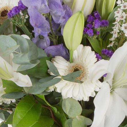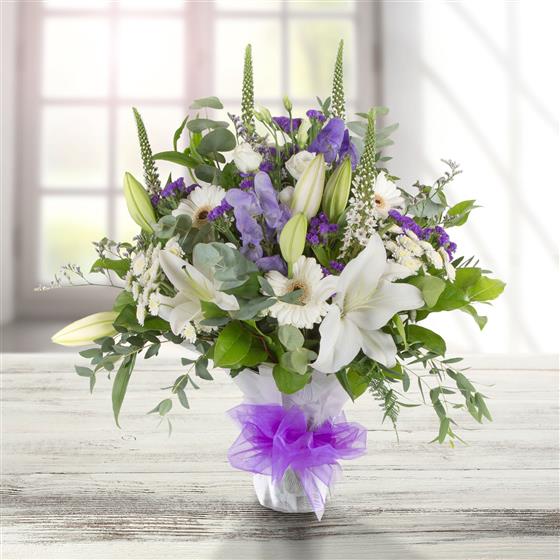 An elegant bouquet of white and purple blooms including scented oriental lilies, statice, limonium and wispy foliage.