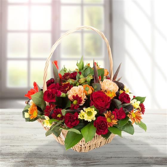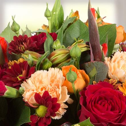 A rich mix of deep reds, rusts and golds. Including roses, spray carnations, alstromeria and chrysanthemums.