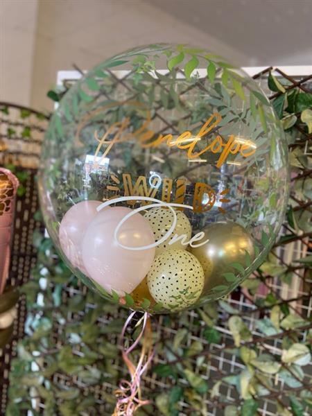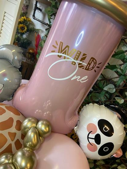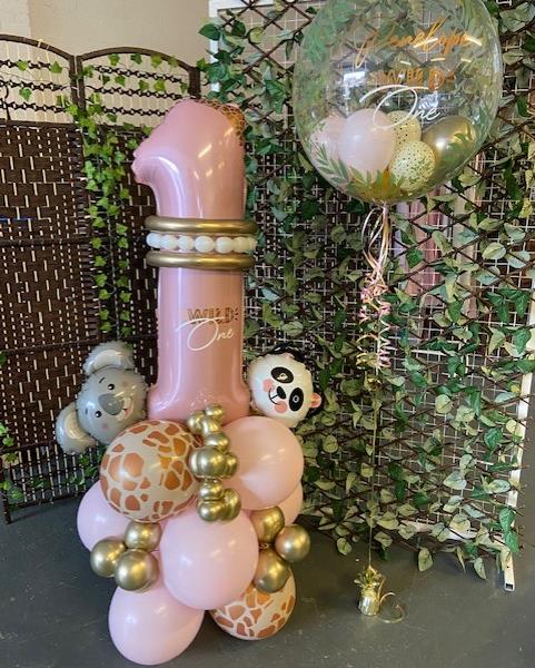 Wild One balloon package includes wild one number stack and personalised bubble balloon available in pink, blue or neutral