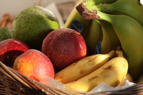 The mixed basket contains a mixture of seasonal fruits, along with the usual apples, bananas, pears, oranges and grapes.